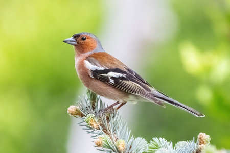 Common chaffinch sits on a branch in spring on green background. Beautiful songbird Common chaffinch in wildlife. The common chaffinch or simply the chaffinch, latin name Fringilla coelebs.