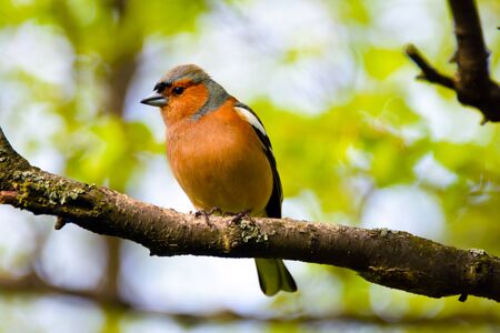 Fringilla coelebs. Photographed in the Czech Republic. Spring nature. From bird life. Bird on the tree. Green Tree. Beautiful picture. The wild nature of the Czech Republic. Europe. Czech Republic. Sp