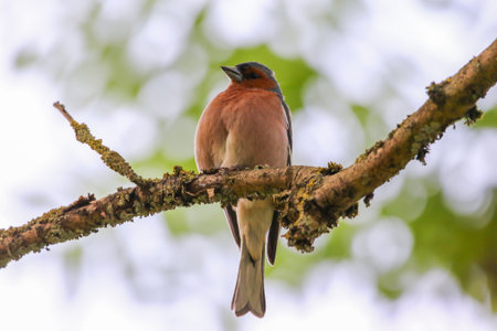 A male common chaffinch sitting on top of a tree, sunny day in summer