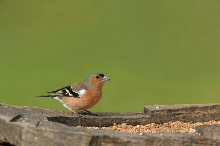Male chaffinch standing on an oak bird feeder with seeds in its mouth, set against a green background.