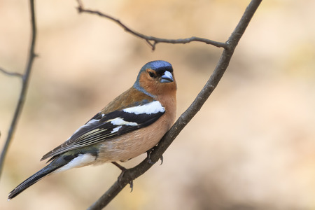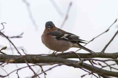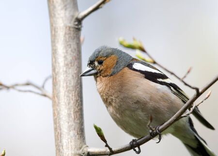 Adult common chaffinch perching on thin branch with blurred blue background. Chaffinch (Fringilla coelebs) is small passerine bird with grey crown and dull rust-red breast.