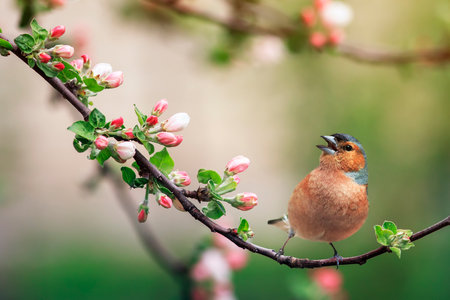 spring bird finch sits on a branch of a blooming pink apple tree and sings