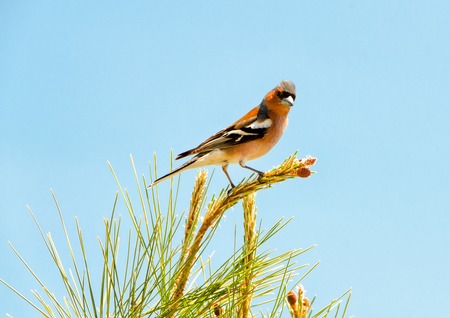 Chaffinch (Fringilla coelebs) most common bird of Europe. A bright bird sits on a pine branch against a blue sky.
