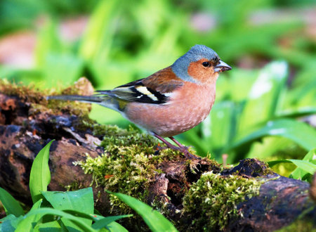 Finch among the spring flowers, spring singing birds, green grass, wildlife with sunny hotspot