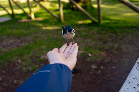 Madeira Chaffinch bird eating from a hand, Madeira island, Portugal