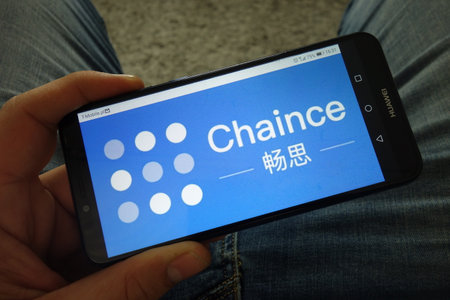 KONSKIE, POLAND - March 31, 2019: Man holding smartphone with Chaince cryptocurrency exchange logo