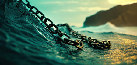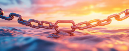 This image explores abstract freedom through flowing, encrypted chains floating above a sunrise It symbolizes online privacy and digital protection Robust chains, seemingly on water, represent secure digital environments This evocative visual of chains in sky and sea illustrates modern digital security, emphasizing secure encryption and data protection AI Generative