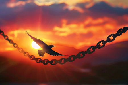 Bird soaring against a colorful sunset, representing freedom and release from bondage