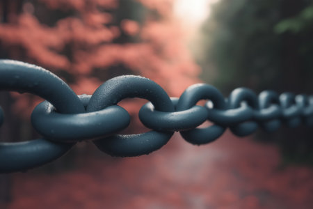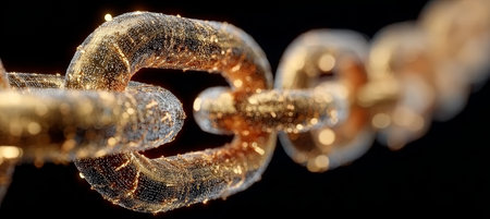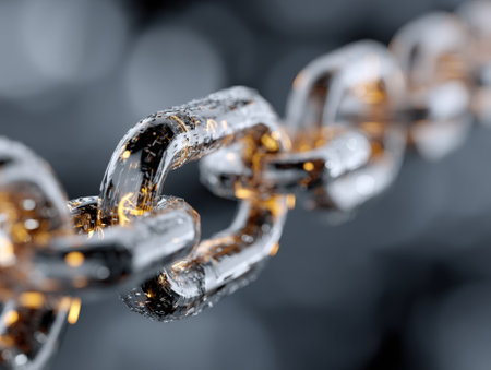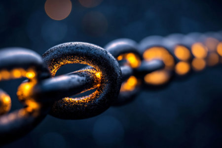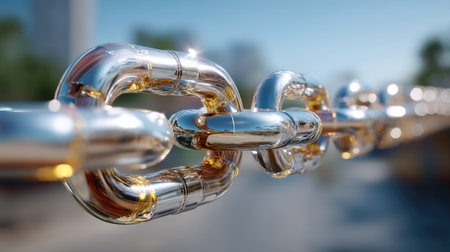 Metallic chain links with a glossy, reflective surface, glowing with warm light, suggesting digital or futuristic theme. Soft focus creates a bokeh effect in the background