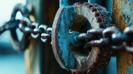 Close-up view of a rusty metal chain, showcasing intricate textures and patterns. The blurred background enhances the industrial aesthetic, evoking strength and durability.