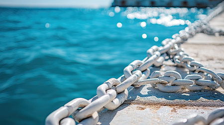 This image showcases a close-up view of a rusty metal chain on a pier, with a vibrant blue sea shimmering in the sunlight, creating an inviting coastal scene.