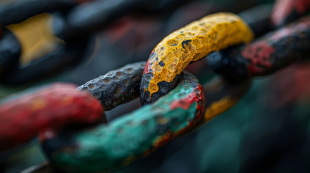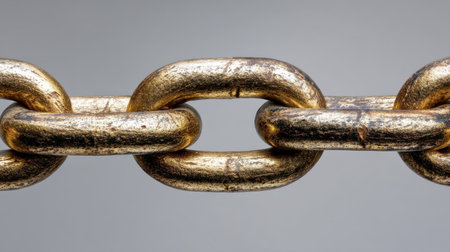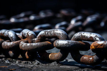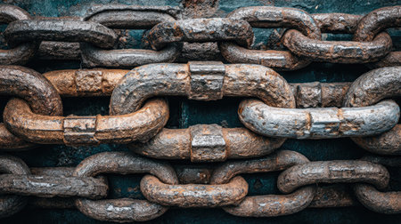 This close-up captures the raw power of heavy metal chain links Rugged texture and aged bronze tones evoke vintage industrial design Macro detail highlights craftsmanship, while the image resonates with themes of connection, resilience, and durability Ideal for backgrounds, graphic elements, and conceptual work AI Generative
