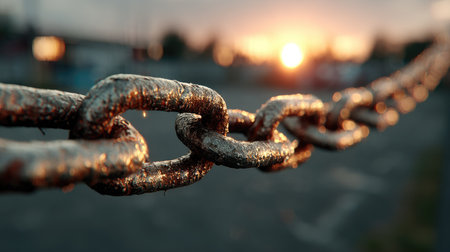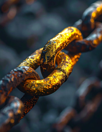 Close up view of metallic chain glistening light, showcasing intricate details and textures. chain links are interlocked, creating sense of strength and durability, with warm glow highlighting its