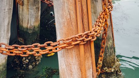 Old Chains. Old metal chain on water background in the sunlight. High quality photo