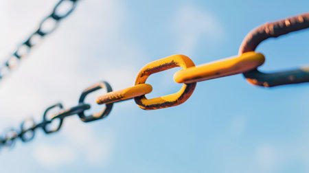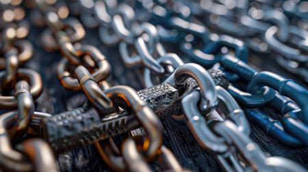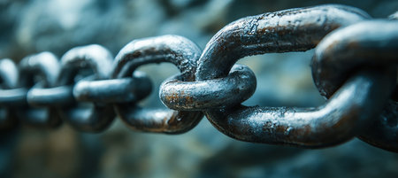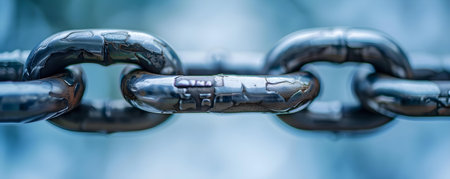 This close-up image captures the intricate details of a robust steel chain link showcasing its strength and durability. Ideal for industrial themes.