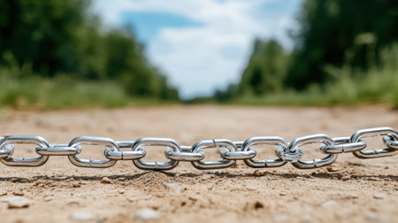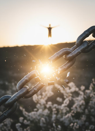 A broken chain lying on dusty ground symbolizes freedom and resilience