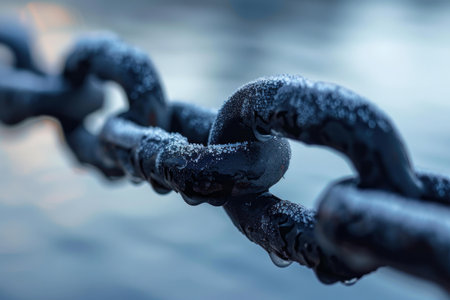 Close up view of a frozen metal chain glittering in the morning light, with a shallow depth of field