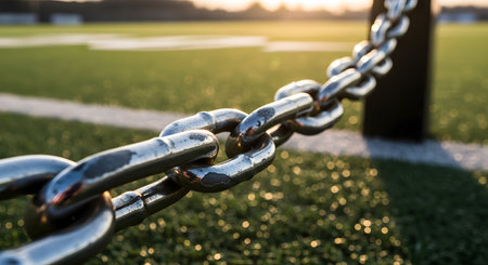 A close-up of a heavy metal chain, part of a first-down marker, on an American football field. The setting sun in the background creates a beautiful bokeh and a warm, dramatic atmosphere for the sport.