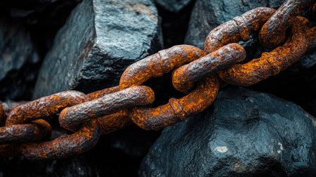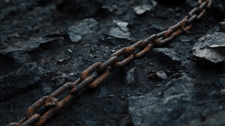 This image features a close-up of a rusty chain lying on a dark, rocky surface. The intricate textures and contrasts create a rugged, industrial aesthetic, evoking themes of decay and resilience.