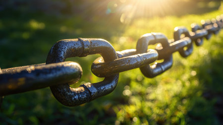 A detailed close-up of metallic chain links illuminated by warm morning sunlight, set against a backdrop of lush green grass, highlighting texture and connection.