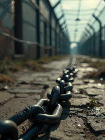 This image captures a black metal chain lying along a cobblestone path within a fenced corridor, leading the eye toward the distant horizon, symbolizing restraint and journey.