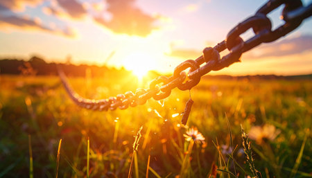 A rusty metal chain with broken links is illuminated by the golden light of a sunset over a grassy field.