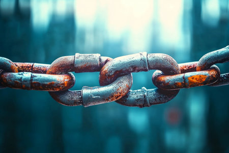 Detailed examination of a fractured chain link, showing its metallic tones and representing weakness and disconnection in structures.