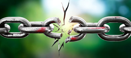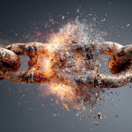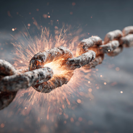 A dynamic close-up capturing a metallic link shattering amid fiery sparks and flying fragments, symbolizing strength breaking free or industrial power
