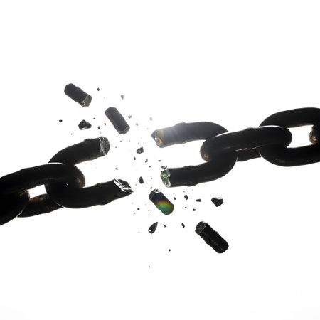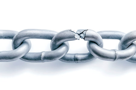 A close-up view of a broken steel chain link against a white background, symbolizing weakness and vulnerability in a system, highlighting the concept of failure.