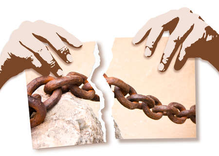 Breaking the chains - concept image with hands ripping photo of an old rusty metal chain.