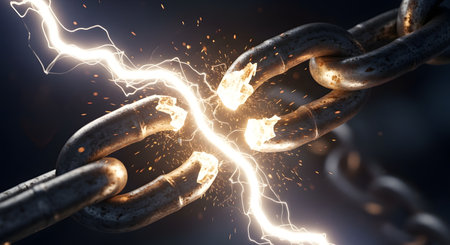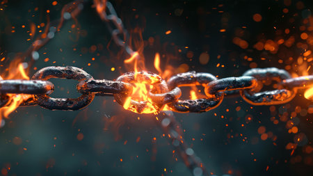A weathered iron chain ruptures, emitting fiery fissures and sparks that capture a moment of collapse, illustrating fragility and the breakdown of strength.