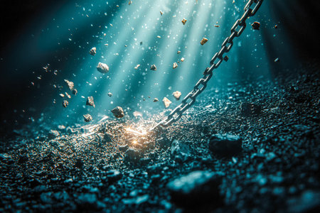 Sunlight filters through as shattered chains emerge from rugged terrain, symbolizing freedom and overcoming obstacles in a powerful, uplifting scene.