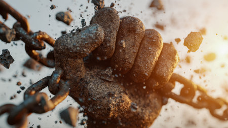 A bold, determined hand crushes aged metal links amid shimmering sparks, set against a muted industrial backdrop, embodying resilience and liberation.