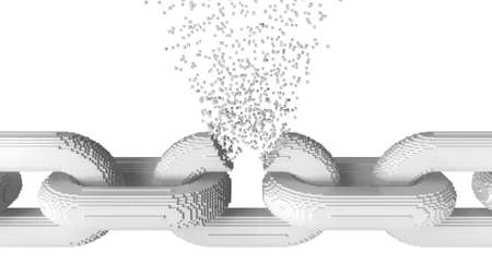 Breaking chain link made with blocks. Blockchain technology problem concept. 3D rendering