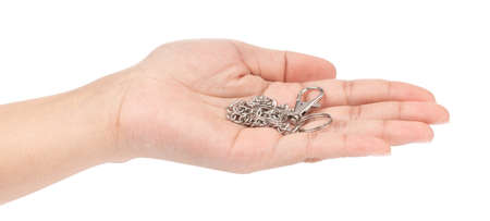 hand holding Long chain of keychain strap isolated on white background