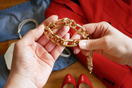 hands with big golden chain on clothes with jacket, bag, jeans, shoes for modern woman outfit background, closeup