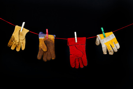 Various work gloves hanging on a rope
