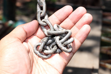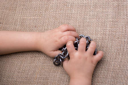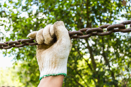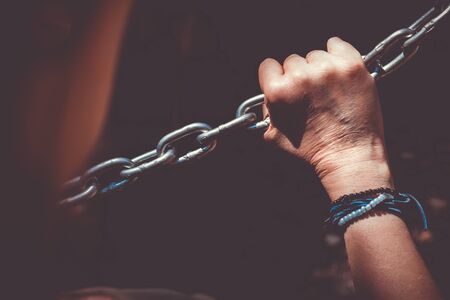 Woman hand holding onto a stainless steel chain. Woman's struggle conept idea