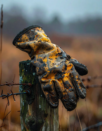 Industrial gloves left behind on the wire mesh fence.
