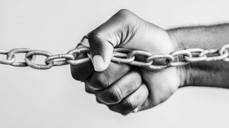 Concept for liberation, enslavement, resistance ... It is a hand making a fist chained by a thick chain