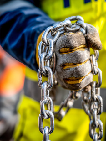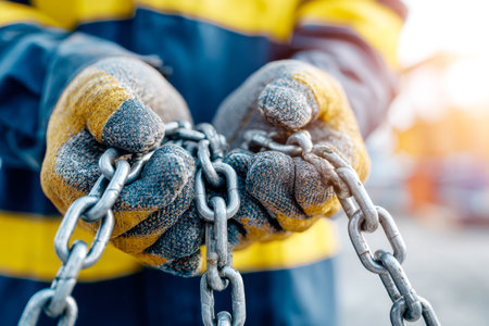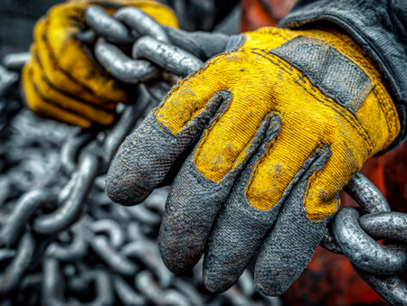 Focused hands in protective gear grasp a sturdy metal link, highlighting strength and resilience in demanding industrial environments.
