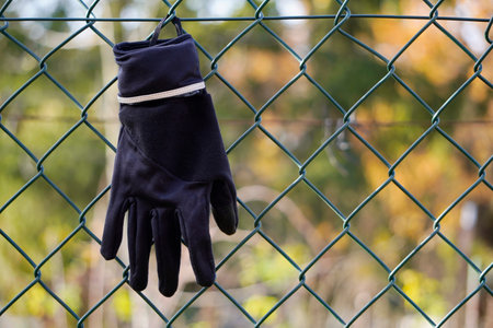 a woman's black warm lost glove hangs on a green fence. find on the street on Sunny autumn day, time to warm up. Lost and found.