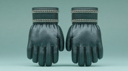 Black leather gloves on light blue background. Pair of male and pair of female gloves. Top view at an angle.