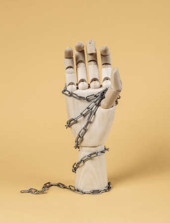 Wooden hand wrapped in a steel chain on a yellow background. Censorship, imprisonment