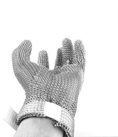 Hand with iron mesh glove on white background. Protection devices for industrial applications. Black and white tone.