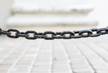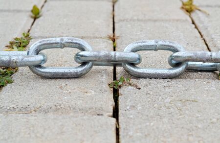 Closeup of a strong metal chain stretched on the pavement