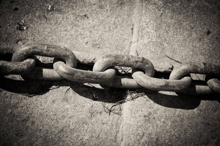 Closeup of a harbor s rusted thick anchor chain lying on the ground