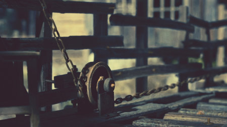 A rusted chain coiled on a rotating beam, a part of an old water well