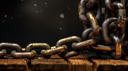 Rusty chains hang in dimly lit environment, showcasing their weathered texture and intricate links. atmosphere evokes sense of mystery and history, drawing attention to aged metal