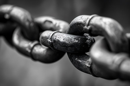 A close-up of a chain link, showing a black and rusty surface, symbolizing strength and the passage of time.